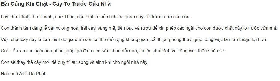 Hôm nay, là ngày …. tháng ….. năm …. con tên là ….. cư trú tại ….. chúng con có việc cần phải Chặt cây…, nay con xin bạch với chư vị để chư vị chuyển nơi ở. Sau 3 ngày nữa (hoặc sau đây nếu chặt luôn sau đó) người trần chúng con xin phép được Chặt cây (hoặc tỉa cành).