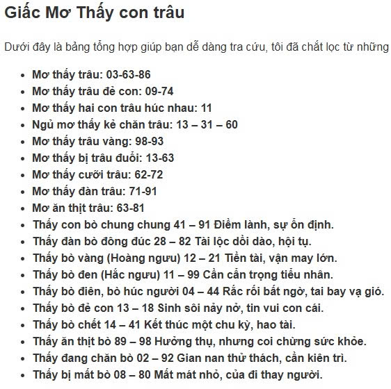 - Thấy bò vàng (Hoàng ngưu) 12 – 21 Tiền tài, vận may lớn.